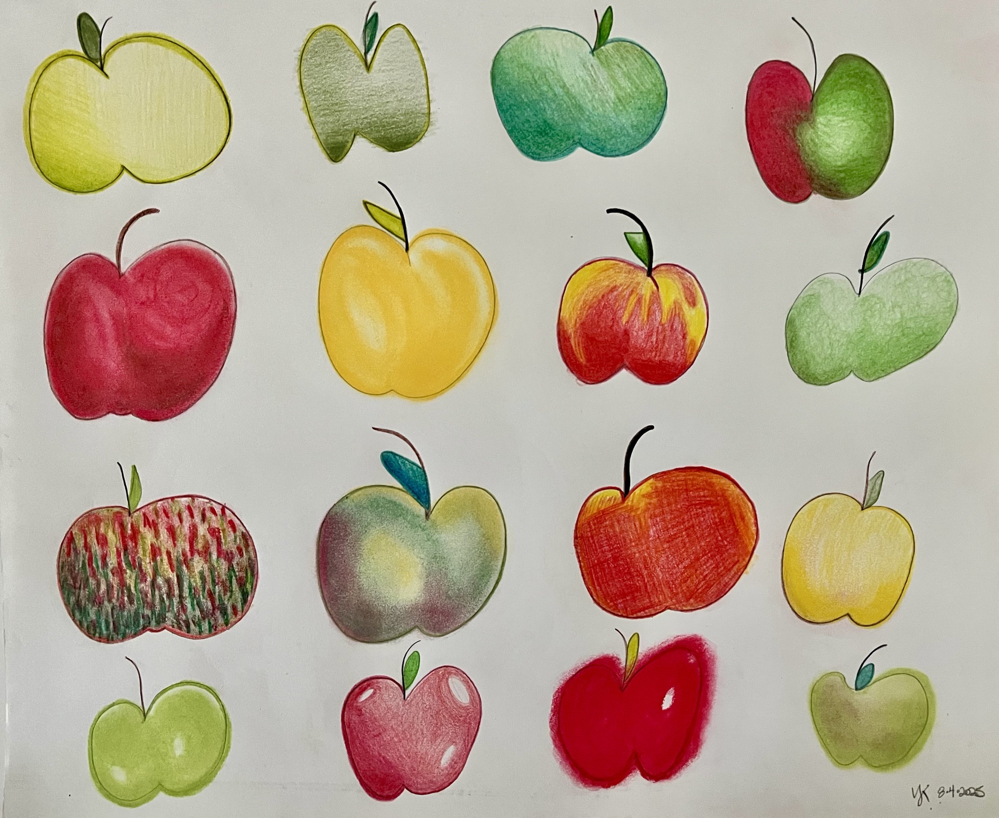For materials, I used dry media paper, colored pencil and chalk pastels. I think my favorite might be the greenish-yellow with hints of red apple that’s 2 columns over, 3 rows down. Second place goes to the yellow-red apple that’s 3 columns over, 2 rows down.